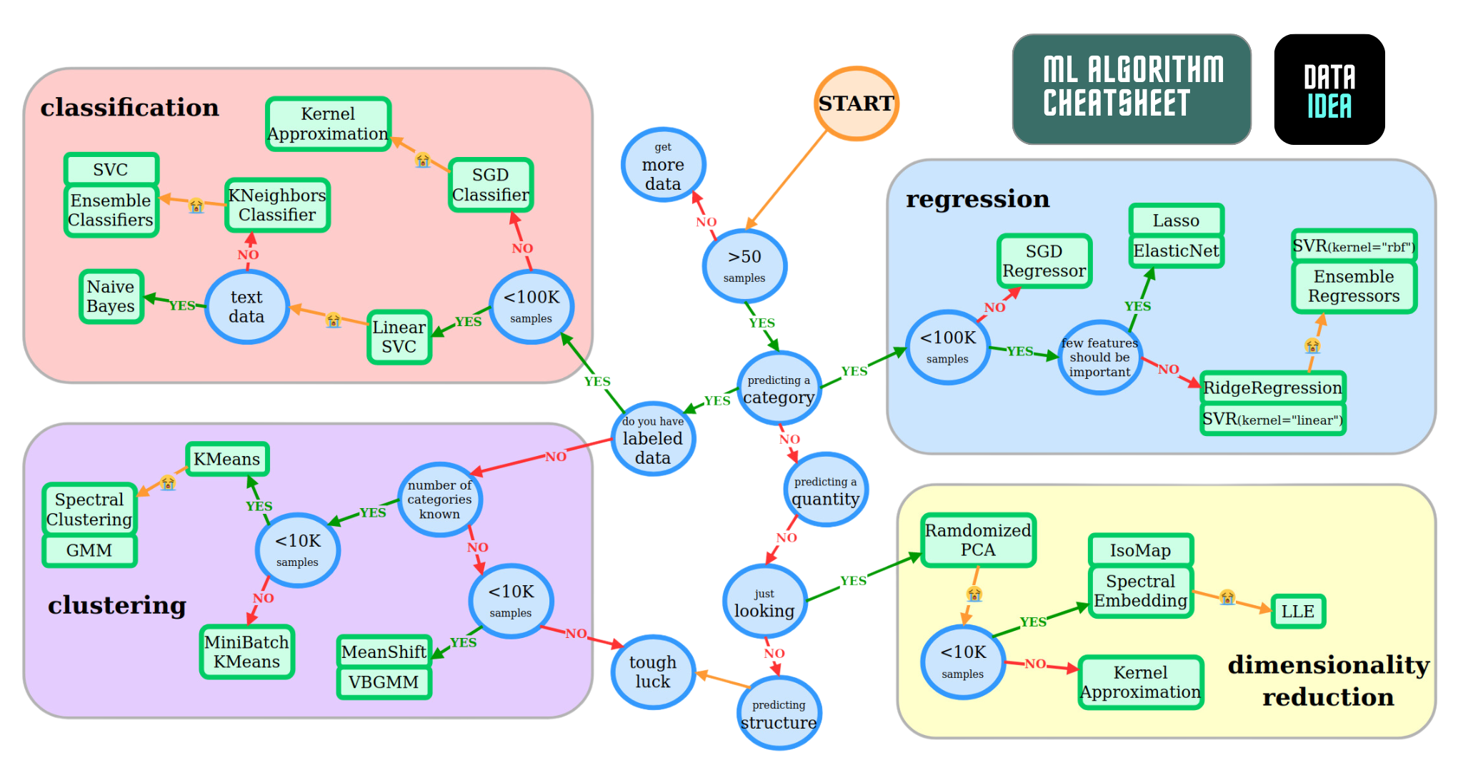 Scikit-learn offers the following cheatsheet to decide which model to pick for a given problem. Can you identify the unsupervised learning algorithms?
